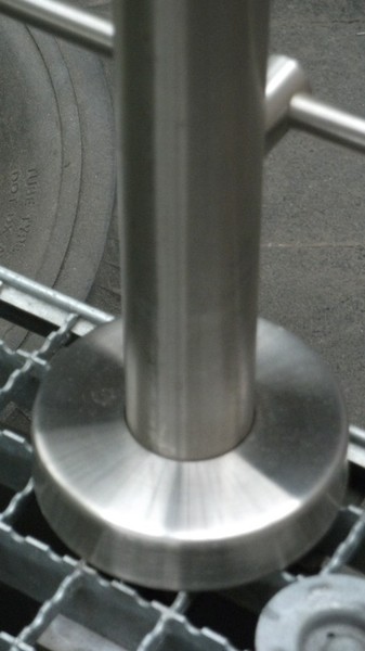 Der Handlauf D=42,4mm ist seitlich geschlossen und mit Bolzen D=12mm auf die Pfosten geschweißt.